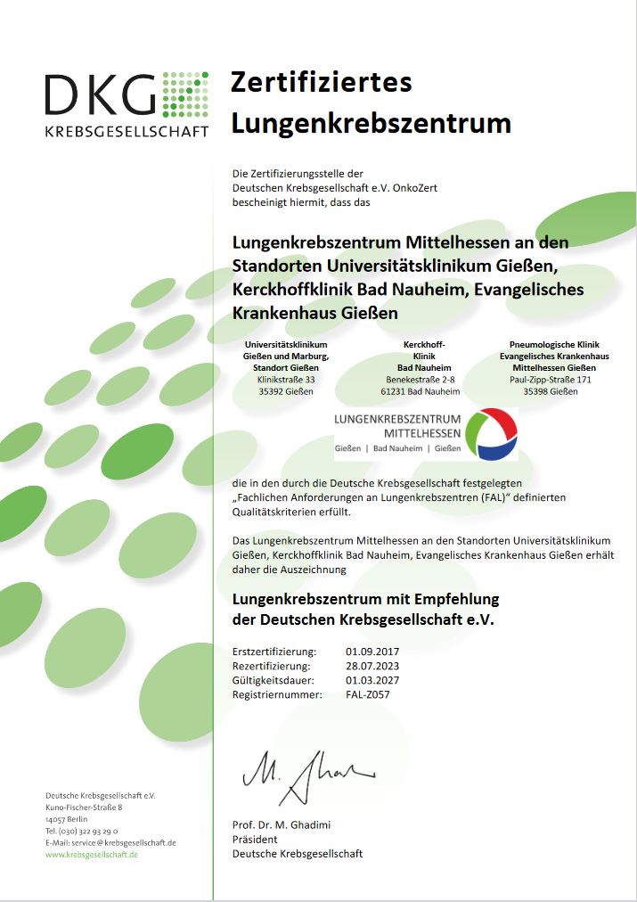 Wer alles beteiligt ist?Wir bündeln Kompetenzen der Fachrichtungen Pneumologie, Thoraxchirurgie, Pathologie, Onkologie, Radiologie, Nuklearmedizin, Strahlentherapie, Anästhesie, Psychoonkologie, Seelsorge, Psychosozialer Dienst, Palliativmedizin der Klinikstandorte Gießen (UKGM), Bad Nauheim (Kerckhoff-Klinik) und das Evangelische Krankenhaus Mittelhessen (Gießen). Alle Teams stellen dem Lungenkrebszentrum Mittelhessen ihre ganze Erfahrung und Expertise zur Verfügung. Wir drei sind eins: